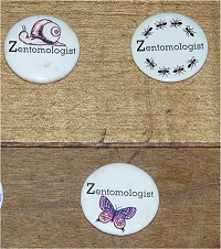 She also posted "His definition of zentomology was learning to be one with insects instead of trying to kill them. Learn about them, plant catch plants, encourage lady beetles, and have a good time in the garden. I still have the little enamel lapel pin he gave me with "Zentomologist" and a fat yellow and black bumblebee on it." As soon as I read her post I knew I had to find and go thru my old button stash, because I could remember a bunch of buttons with insects on them that I was sure had the "zentomologist" pun on them that I'd loved -- and I was right.